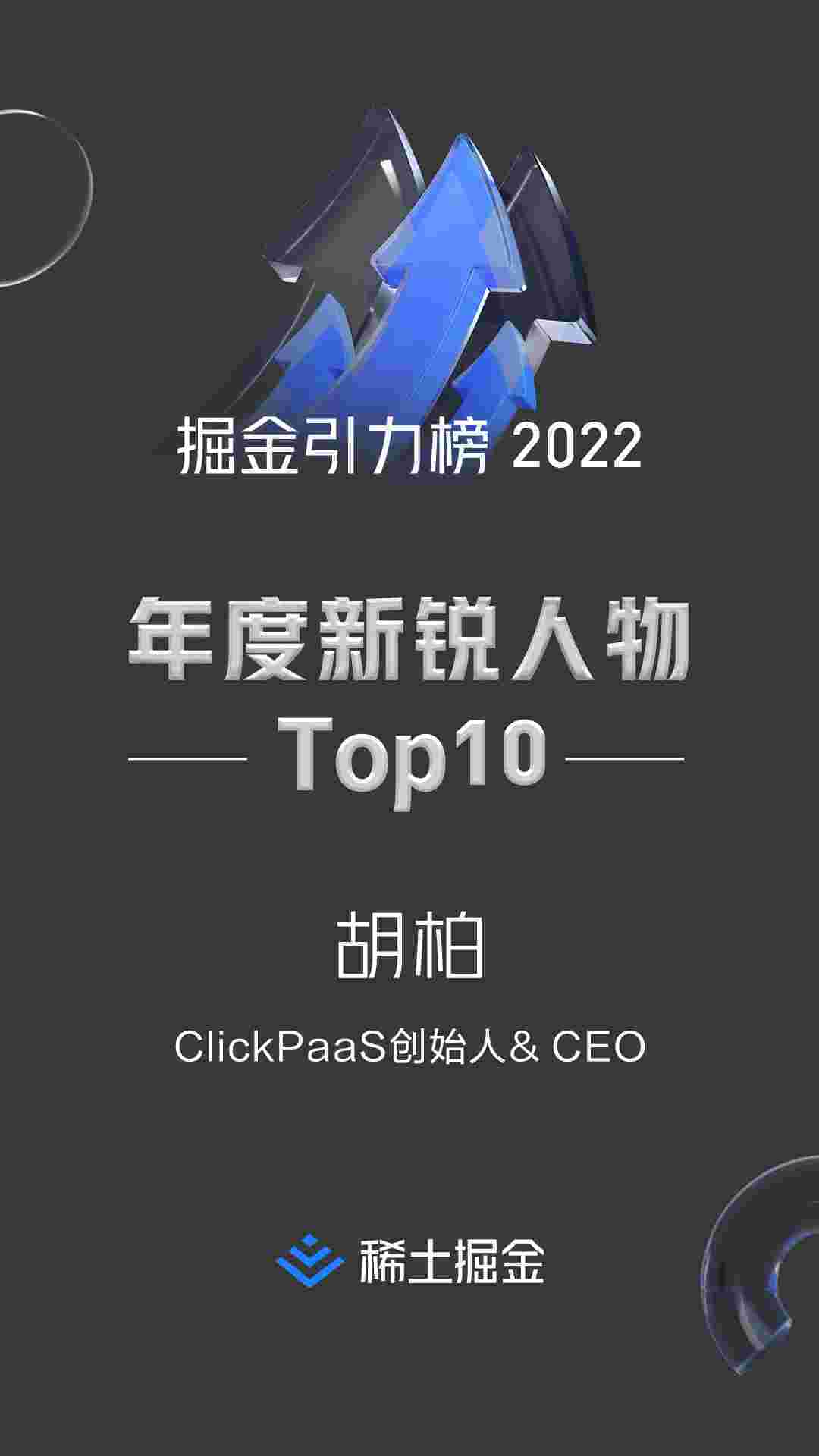 2022年1月6日,,,,稀土掘金社区第一届「掘金未来大会」成功举办,,,,,,,,,,,,会上发布了“2022 稀土掘金引力榜 年度新锐人物”榜单,,,,,,,上海爱湃斯科技有限公司(简称EBPAY)创始人及CEO胡柏实力入选年度新锐人物TOP 10。。。。。。。。。